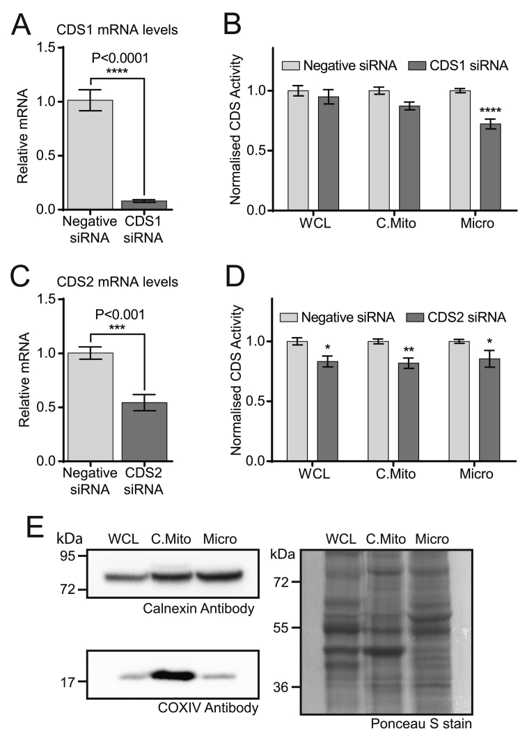 CDP diacylglycerol synthase (CDS) catalyses the conversion of phosphatidic acid (PA) to CDP-diacylglycerol, an essential intermediate in the synthesis of phosphatidylglycerol, cardiolipin and phosphatidylinositol (PI). CDS activity has been identified in mitochondria and endoplasmic reticulum of mammalian cells apparently encoded by two highly-related genes, CDS1 and CDS2. Cardiolipin is exclusively synthesised in mitochondria and recent studies in cardiomyocytes suggest that the peroxisome proliferator-activated receptor γ coactivator 1 (PGC-1α and β) serve as transcriptional regulators of mitochondrial biogenesis and up-regulate the transcription of the CDS1 gene. Here we have examined whether CDS1 is responsible for the mitochondrial CDS activity. We report that differentiation of H9c2 cells with retinoic acid towards cardiomyocytes is accompanied by increased expression of mitochondrial proteins, oxygen consumption, and expression of the PA/PI binding protein, PITPNC1, and CDS1 immunoreactivity. Both CDS1 immunoreactivity and CDS activity were found in mitochondria of H9c2 cells as well as in rat heart, liver and brain mitochondria. However, the CDS1 immunoreactivity was traced to a peripheral p55 cross-reactive mitochondrial protein and the mitochondrial CDS activity was due to a peripheral mitochondrial protein, TAMM41, not an integral membrane protein as expected for CDS1. TAMM41 is the mammalian equivalent of the recently identified yeast protein, Tam41. Knockdown of TAMM41 resulted in decreased mitochondrial CDS activity, decreased cardiolipin levels and a decrease in oxygen consumption. We conclude that the CDS activity present in mitochondria is mainly due to TAMM41, which is required for normal mitochondrial function.
