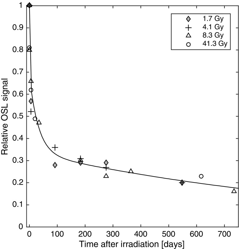 In this study the dosimetric properties of alumina (Al2O3) substrates found in resistors retrieved from mobile phones were investigated. Measurements of the decline of optically stimulated luminescence (OSL) generated following exposure of these substrates to ionising radiation showed that 16% of the signal could still be detected after 2 years (735 days). Further, the magnitude of the regenerative dose (calibration dose; D i) had no impact on the accuracy of dose estimates. Therefore, it is recommended that the D i be set as low as is practicable, so as to accelerate data retrieval. The critical dose, D CL, and dose limit of detection, D DL, taking into account the uncertainty in the dose-response relation as well as the uncertainty in the background signal, was estimated to be 7 and 13 mGy, respectively, 1 h after exposure. It is concluded that given the significant long-term component of fading, an absorbed dose of 0.5 Gy might still be detectable up to 6 years after the exposure. Thus, OSL from alumina substrates can be used for dosimetry for time periods far in excess of those previously thought.