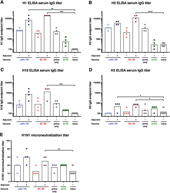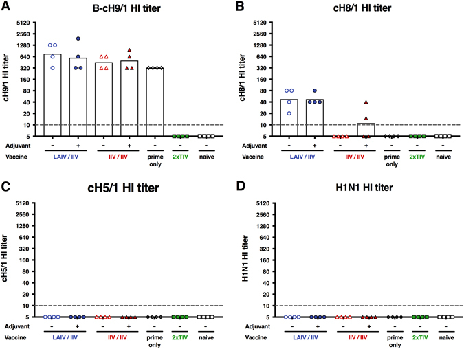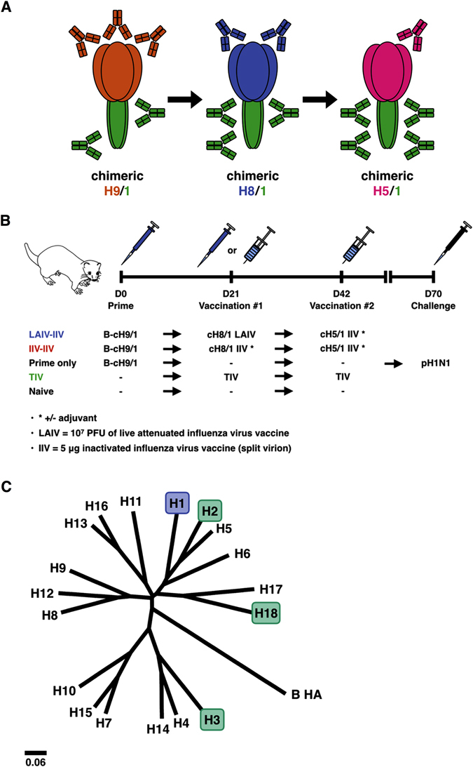 Influenza viruses evade human adaptive immune responses due to continuing antigenic changes. This makes it necessary to re-formulate and re-administer current seasonal influenza vaccines on an annual basis. Our pan-influenza vaccination approach attempts to redirect antibody responses from the variable, immuno-dominant hemagglutinin head towards the conserved-but immuno-subdominant-hemagglutinin stalk. The strategy utilizes sequential immunization with chimeric hemagglutinin-based vaccines expressing exotic head domains, and a conserved hemagglutinin stalk. We compared a live-attenuated influenza virus prime followed by an inactivated split-virus boost to two doses of split-virus vaccines and assessed the impact of adjuvant on protection against challenge with pandemic H1N1 virus in ferrets. All tested immunization regimens successfully induced broadly cross-reactive antibody responses. The combined live-attenuated/split virus vaccination conferred superior protection against pandemic H1N1 infection compared to two doses of split-virus vaccination. Our data support advancement of this chimeric hemagglutinin-based vaccine approach to clinical trials in humans.