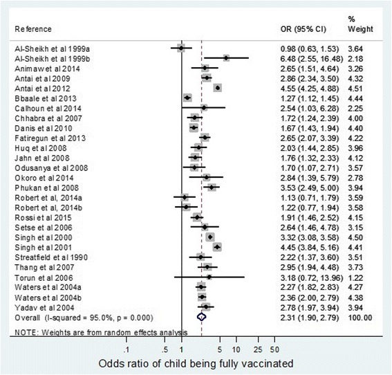 Methods: An electronic database search was conducted using Medline Ovid, Embase and The Cochrane Library using a combination of keywords and appropriate MeSH terms for maternal education and child vaccination. Bibliographies were also hand searched. Data was extracted and entered onto a Microsoft Excel spreadsheet and analysed using STATA 13.0 software. The primary outcome of effect size of maternal education on completion of childhood vaccinations was analysed at different levels. Secondary outcomes were explored using subgroup analyses of differences between continents, rural or urban settings, and dates.