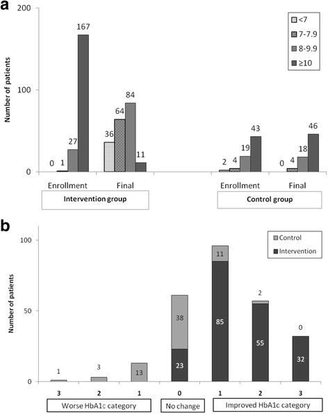 Results: In the intervention group, there were statistically significant (p < 0.05) post-intervention (relative) reductions in the levels of HbA1c (-27.1%, 95% CI = -28.9%, -25.3%), FBG (-17.10%, 95% CI = -23.3%, -10.9%), total cholesterol (-9.93%, 95% CI = -12.7%, -7.9%), LDL cholesterol (-11.4%, 95% CI = -19.4%, -3.5%), systolic BP (-1.5%, 95% CI = -2.9%, -0.03%), and diastolic BP (-3.4%, 95% CI = -5.2%, -1.7%). There was a significant decrease in the number of patients with a HbA1c ≥10 (86 mmol/mol) from 167 patients at enrollment to 11 patients after intervention (p < 0.001). However, the intervention group experienced a statistically significant increase in body weight (3.7%, 95% CI = 2.9%, 4.5%). In the control group, no statistically significant changes were noticed in different outcomes with the exception of total cholesterol (-4.10%, p = 0.07). In the linear regression model, the intervention and the total number of clinic visits predicted HbA1c improvement.