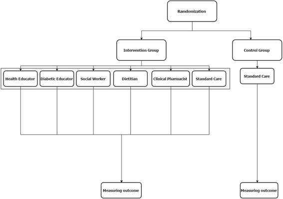 Methods: In a randomized, parallel-group trial, we assigned 263 patients with poorly controlled type 2 diabetes mellitus (T2DM) to either a control group, standard care program, or a multidisciplinary care program involving a senior family physician, clinical pharmacy specialist, dietician, diabetic educator, health educator, and social worker. The participants were followed for a median of 10 months, between September 2013 and September 2014. Glycated hemoglobin (HbA1c), fasting blood glucose (FBG), lipid profiles, and blood pressure (BP) were measured. The assignment was blinded for the assessors of the study outcomes. The study registry number is.