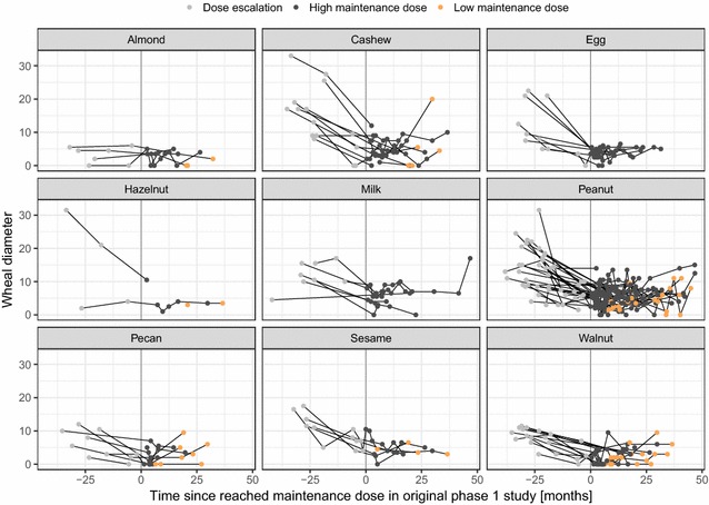 Methods: The participants (n = 46) were followed up to 72 months since the time they reached 2 g maintenance dose per food in the initial phase 1 trial. During the long-term maintenance dosing, participants continued or reduced the initial maintenance dose of food allergen protein to high (median 2 g protein) vs. low (median 300 mg protein). Participant follow-up included clinical monitoring, standardized OFCs, and in some cases, skin prick tests and measurement of allergen-specific IgE and IgG4.