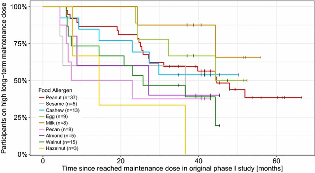 Conclusion: Our LTFU cohort of food OIT participants from a single site, phase 1 OIT study, supports the feasibility of sustained desensitization through long-term maintenance dosing. Trial registration Registry: Clinicaltrial.gov. Registration numbers: NCT01490177 (original study); NCT03234764 (LTFU study). Date of registration: November 29, 2011 (original study); July 26, 2017 (LTFU study, registered).