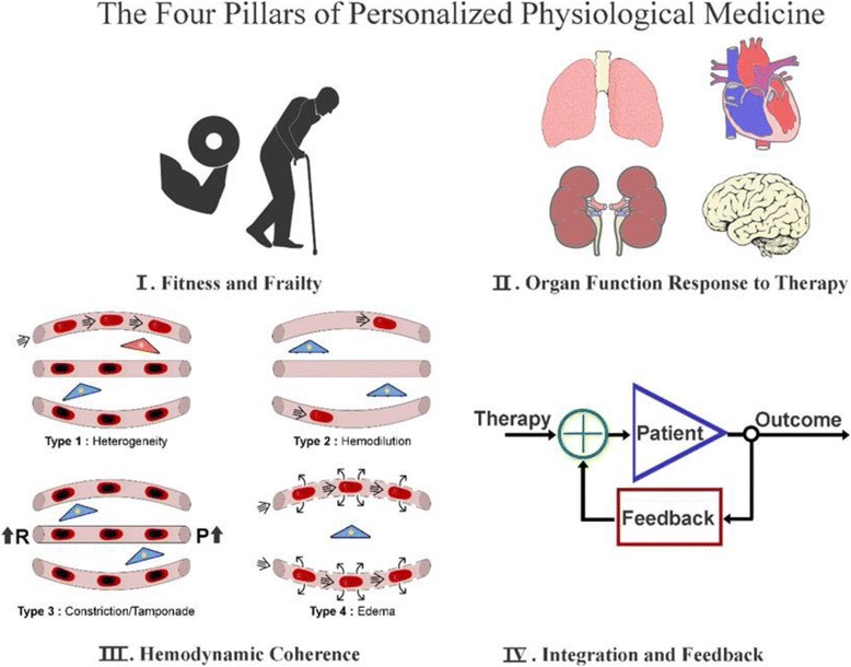 This paper introduces the concept of personalized physiological medicine that is specifically directed at the needs of the critically ill patient. This differs from the conventional view of personalized medicine, characterized by biomarkers and gene profiling, instead focusing on time-variant changes in the pathophysiology and regulation of various organ systems and their cellular and subcellular constituents. I propose that personalized physiological medicine is composed of four pillars relevant to the critically ill patient. Pillar 1 is defined by the frailty and fitness of the patient and their physiological reserve to cope with the stress of critical illness and therapy. Pillar 2 involves monitoring of the key physiological variables of the different organ systems and their response to disease and therapy. Pillar 3 concerns the evaluation of the success of resuscitation by assessment of the hemodynamic coherence between the systemic and microcirculation and parenchyma of the organ systems. Finally, pillar 4 is defined by the integration of the physiological and clinical data into a time-learning adaptive model of the patient to provide feedback about the function of organ systems and to guide and assess the response to disease and therapy. I discuss each pillar and describe the challenges to research and development that will allow the realization of personalized physiological medicine to be practiced at the bedside for critically ill patients.