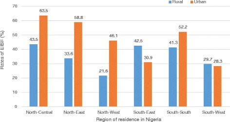Conclusions: Rural-urban differences in the rates and factors associated with EIBF exist in Nigeria with rural residence having significantly lower rates. Intervention efforts which address the risk factors identified in this study may contribute to improved EIBF rates. Efforts need to prioritize rural mothers generally, (particularly, those in rural North-West region) as well as mothers in urban South-West region of Nigeria.