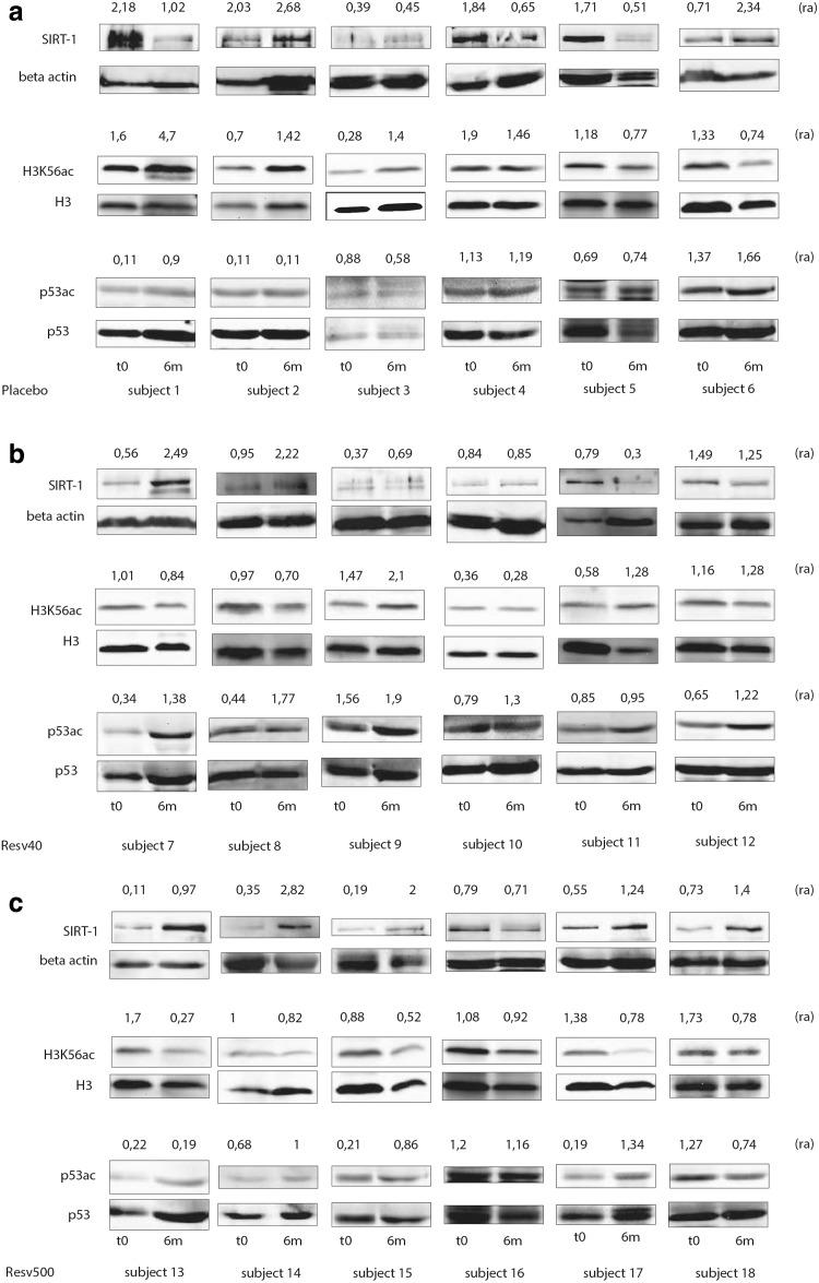 Methods and results: At baseline, peripheral blood mononuclear cell H3K56ac values among the SIRT-1 tertiles did not differ. At trial end, SIRT-1 levels were significantly higher in patients receiving 500 mg resveratrol. At follow-up, patients were divided into tertiles of delta (trial end minus baseline) SIRT-1 value. Significant reductions in H3K56ac and body fat percentage were found in the highest tertile as were increased TAS levels. A multiple logistic regression model showed that the highest delta SIRT-1 tertile was inversely associated with variations in H3K56ac (OR = 0.66; 95% CI 0.44-0.99), TAS (OR = 1.01; 95% CI 1.00-1.02), and body fat percentage (OR = 0.75; 95% CI 0.58-0.96).