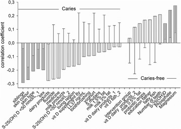 Results: Dental status was evaluated in 85 of the 206 children in the basic intervention study. Low vitamin D levels were found in 28% at baseline compared to 11% after the intervention, and 34% reported continued intake of vitamin D supplements. Logistic regression supported a weak inverse association between vitamin D status at 6 years of age and caries 2 years later (odds ratio 0.96; p = 0.024) with minor attenuation after an adjustment for potential confounders. Multivariate projection regression confirmed that insufficient vitamin D levels correlated with caries and higher vitamin D levels correlated with being caries-free. Vitamin D status at 6 years of age was unrelated to enamel defects but was positively associated with saliva LL37 levels.