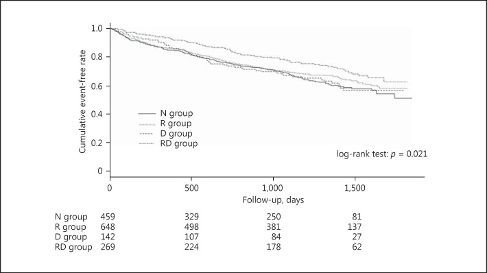 Results: Significant differences were observed in the incidence of CV events and all-cause mortality between the 4 groups (p = 0.021 and p = 0.001, respectively). Cox proportional hazard analysis revealed that the incidence of CV events was significantly lower in the RD group than in the N group (hazard ratio [HR] = 0.65, 95% confidence interval [CI]: 0.50-0.86, p = 0.002). Multivariate analysis revealed that the incidence of CV events was significantly lower in the RD group than in the N group (HR = 0.66, 95% CI: 0.47-0.93, p = 0.016).