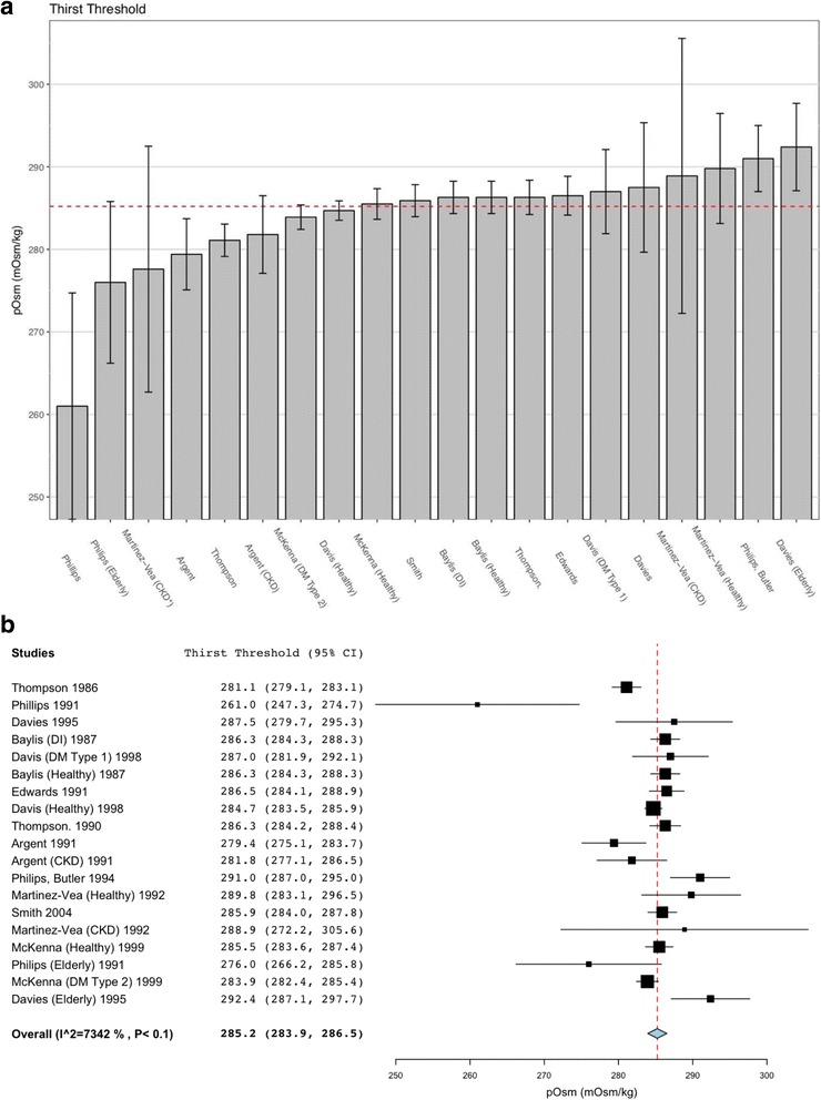Results: A total of 12 trials were included that assessed thirst intensity on a visual analogue scale, as a function of plasma osmolality (pOsm), and employed linear regression to define the thirst threshold. This included 167 participants, both healthy controls and those with a range of pathologies, with a mean age of 41 (20-78) years.The value ±95% CI for the pOsm threshold for thirst sensation was found to be 285.23 ± 1.29 mOsm/kg. Above this threshold, thirst intensity as a function of pOsm had a mean ± SEM slope of 0.54 ± 0.07 cm/mOsm/kg. The mean ± 95% CI vasopressin release threshold was very similar to that of thirst, being 284.3 ± 0.71 mOsm/kg.Heterogeneity across studies can be accounted for by subtle variation in experimental protocol and data handling.