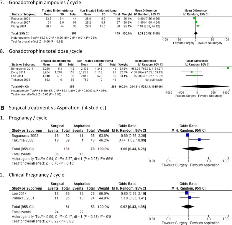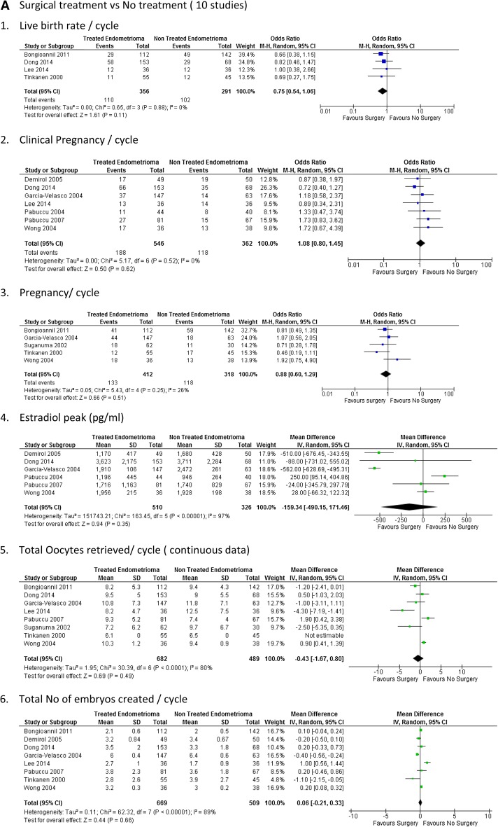 Results: An extensive search of electronic databases for articles published from inception to September 2016 yielded 11 eligible studies for meta-analysis. Meta-analysis was conducted comparing surgery versus no treatment of endometrioma. There were no significant differences in pregnancy rate per cycle, clinical pregnancy rate and live birth rate between women who underwent surgery for endometrioma and those who did not.