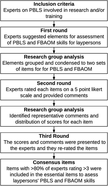 Methods: A Delphi consensus survey was conducted. Out of a total of 84 invited experts, 28 agreed to participate. During the first Delphi round experts suggested items to assess laypersons' PBLS and FBAOM skills. In the second round, the suggested items received comments from and were rated by 26 experts (93%) on a 5-point scale (1 = not relevant to 5 = essential). Revised items were anonymously presented in a third round for comments and 23 (82%) experts completed a re-rating. Items with a score above 3 by more than 80% of the experts in the third round were included in an assessment instrument.