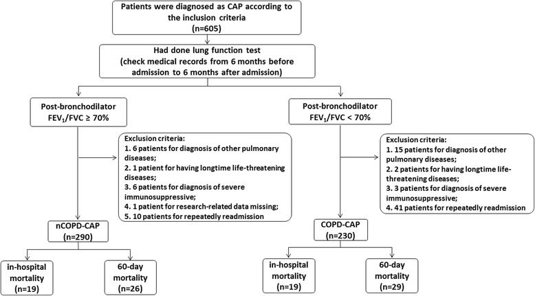 Results: Of the total 520 CAP patients, 230 (44.2%) patients had been diagnosed comorbid with COPD (COPD-CAP). CAP patients comorbid with COPD patients had higher rate of need for ICU admission (18.3% vs 13.1%) and need for NIMV (26.1% vs 1.4%) than without COPD (nCOPD-CAP). The PSI, CURB-65 and APACHE-II scores in COPD-CAP patients were higher than that in nCOPD-CAP patients (95 vs 79, P < 0.001; 1 vs 1, P < 0.001; 13 vs 8, P < 0.001, respectively). Logistic regression analysis indicated that aspiration, D-dimer > 2.0 μg/mL and CURB-65 ≥ 3 were risk factors associated with in-hospital mortality ((odd ratio) OR = 5.678, OR = 4.268, OR = 20.764, respectively) in COPD-CAP patients. The risk factors associated with 60-day mortality in COPD-CAP patients were comorbid with coronary heart disease, aspiration, need for NIMV (non-invasive mechanical ventilation) and CURB-65 ≥ 3 (OR = 5.206, OR = 7.921, OR = 3.974, OR = 18.002, respectively).