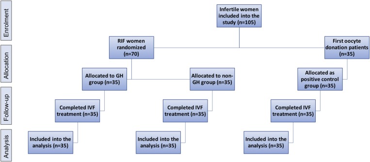 Design and study population: A total of 105 infertile women were enrolled in the randomized controlled trial: 70 women were with a history of RIF with donated oocytes, and 35 infertile women underwent the first oocyte donation attempt. Women receiving donated oocytes were treated with progressively increasing doses of oral estradiol, followed by intravaginal progesterone after previous pituitary desensitization with gonadotropin-releasing hormone agonist. Thirty-five RIF patients were treated with GH (GH patients), whereas the rest of the 35 RIF patients (non-GH patients) and 35 first-attempt patients (positive control group) were not.