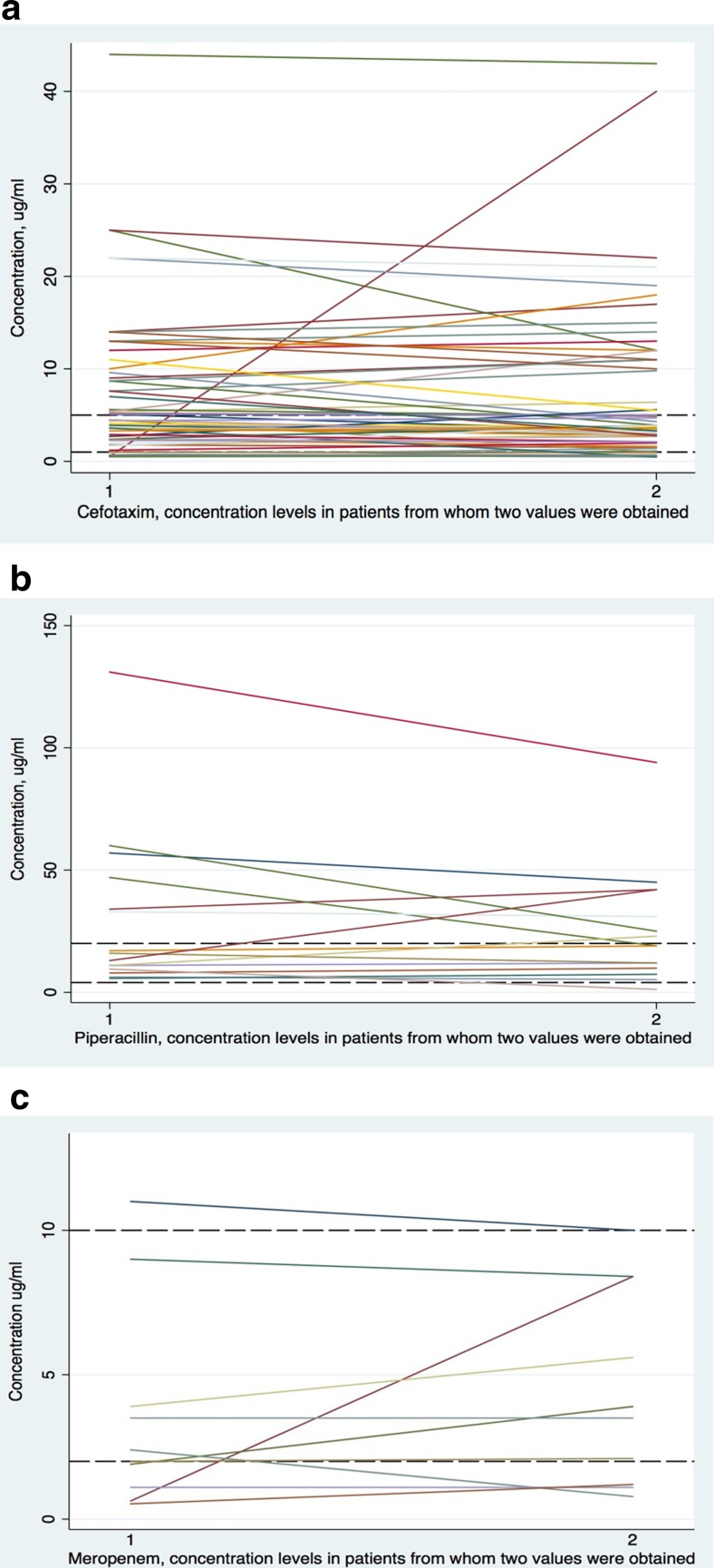 In older adults, few studies confirm that adequate concentrations of antibiotics are achieved using current dosage regimens of intravenous β-lactam antibiotics. Our objective was to investigate trough concentrations of cefotaxime, meropenem, and piperacillin in older adults hospitalized with infection. We included 102 patients above 70 years of age. Total trough antibiotic concentrations were measured and related to suggested target intervals. Information on antibiotic dose, patient characteristics, and 28-day outcomes were collected from medical records and regression models were fitted. Trough concentrations for all three antibiotics exhibited considerable variation. Mean total trough concentrations for cefotaxime, meropenem, and piperacillin were 6.5 mg/L (range 0-44), 3.4 mg/L (range 0-11), and 30.2 mg/L (range 1.2-131), respectively. When a target range of non-species-related breakpoint - 5× non-species-related breakpoint was applied, only 36% of patients had both values within the target range. Regression models revealed that severe sepsis was associated with varying concentration levels and increasing age and diminishing kidney function with high concentration levels. The study was not powered to demonstrate consequences in clinical outcomes. Conclusively, in older adults treated with cefotaxime, meropenem, or piperacillin-tazobactam, trough antibiotic concentrations varied considerably. Better predictors to guide dosing regimens of β-lactam antibiotics or increased use of therapeutic drug monitoring are potential ways to address such variations.