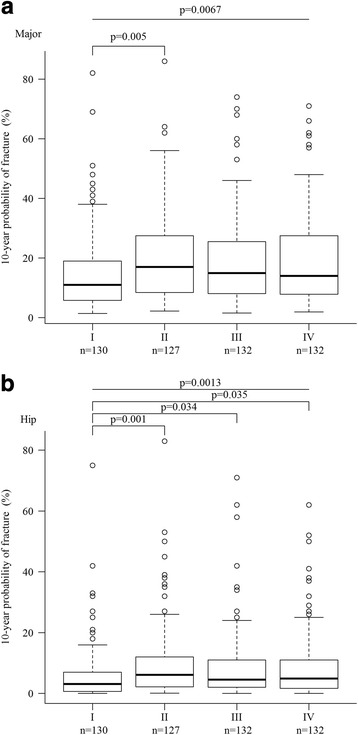 Results: Five hundred twenty-one patients with RA were enrolled through May 31, 2016. In total, 359 (68.9%) patients were anti-CCP+. Compared with anti-CCP- patients, anti-CCP+ patients had a significantly higher DAS28-ESR (p = 0.0001) and 10-year probability of major (15.0 [18.9] vs. 12.0 [15.3], p = 0.0461) or hip (5.0 [9.2] vs. 3.6 [8.2], p = 0.0118) fracture, but a significantly lower BMD of the FN (p = 0.0196). The rates of osteoporosis and previous fracture were comparable. There were 130, 127, 132, and 132 patients in groups I-IV, respectively. The DAS28-ESR was significantly different (p = 0.0001) among the groups and correlated to anti-CCP levels. The BMD and 10-year probability of major (p = 0.0067) and hip (p = 0.0013) fracture among the groups were also different.