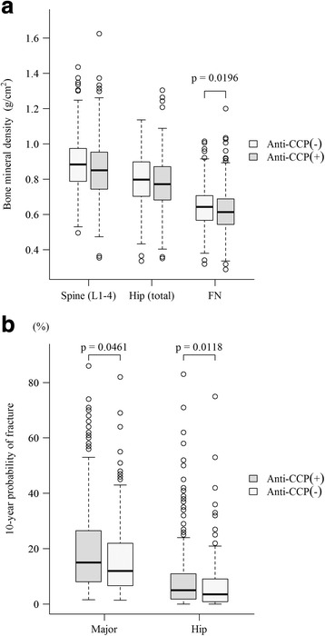 Conclusions: Anti-CCP+ RA patients had a higher 10-year probability of major or hip fracture, independent of anti-CCP levels, and a lower BMD of the FN than anti-CCP- patients.