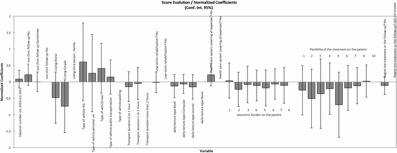 Results: Between baseline and month 24 (M24), 42.4% of the variability in best-corrected visual acuity (BCVA) was explained by the cumulative effect of the following societal factors: intermittent out-patient follow-up, marital status, daily reading, transportation type, commuting time. No isolated societal factor significantly correlated with ETDRS BCVA severity at M24. A trend to correlation was observed between the EDTRS score at M24 and the SSS (P = 0.076), economic burden (P = 0.075), time between diagnosis and treatment initiation (P = 0.070). A significant correlation was found for the disease burdensome on the patient (P = 0.034) and low vision rehabilitation (P = 0.014).