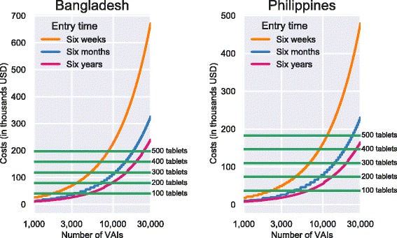 Results: We found that the median time between data collection and data entry for surveys collected on paper and pencil was approximately 3 months. For surveys collected on electronic tablets, this was less than 2 days. For small-scale surveys, we found that the upfront costs of purchasing electronic tablets was the primary cost and resulted in a higher total cost. For large-scale surveys, the costs associated with data entry exceeded the cost of the tablets, so electronic data capture provides both a quicker and cheaper method of data collection.