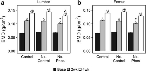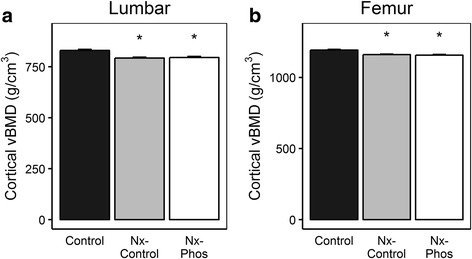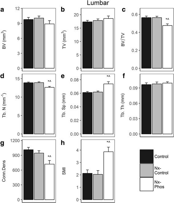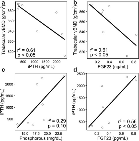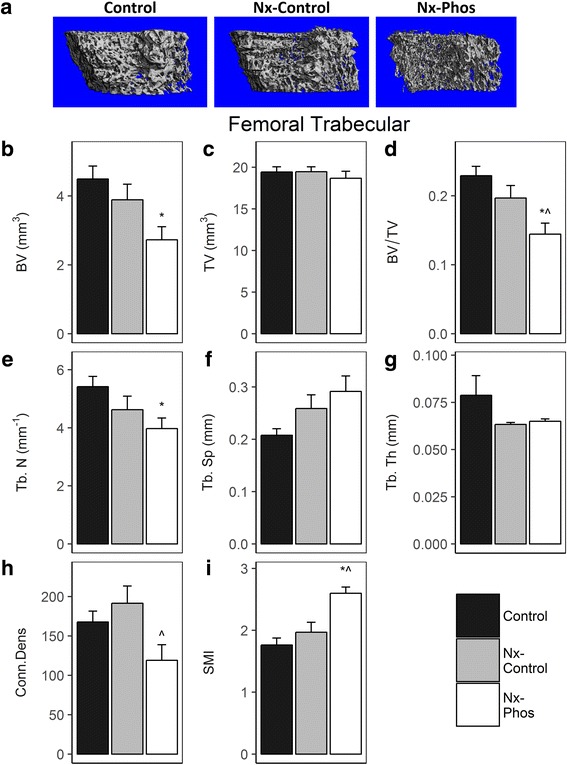 Results: Cortical bone density at the femoral mid-diaphysis was reduced in nephrectomy-control and nephrectomy-high phosphorus compared to control rats. In contrast, trabecular bone mass was reduced at both the lumbar vertebrae and the femoral secondary spongiosa in nephrectomy-high phosphorus but not in nephrectomy-control. Reduced trabecular bone volume adjusted for tissue volume was caused by changes in trabecular number and separation at day 35. Histomorphometry revealed increased bone resorption in tibial secondary spongiosa in nephrectomy-control. High phosphorus diet-induced changes in bone microstructure were accompanied by increased serum parathyroid hormone and fibroblast growth factor 23 levels.