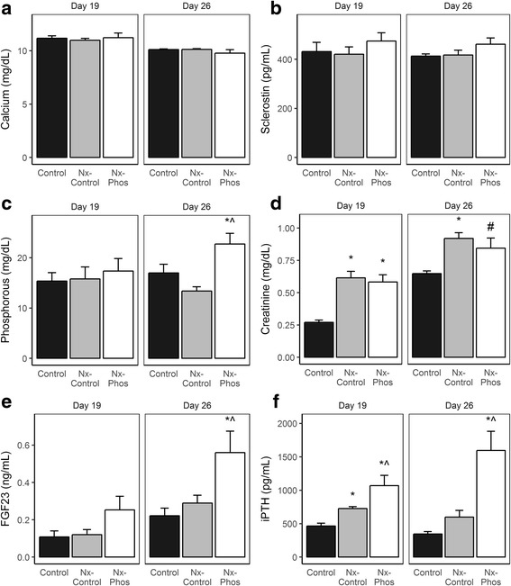 Background: Changes in mineral metabolism and bone structure develop early in the course of chronic kidney disease and at end-stage are associated with increased risk of fragility fractures. The disruption of phosphorus homeostasis leads to secondary hyperparathyroidism, a common complication of chronic kidney disease. However, the molecular pathways by which high phosphorus influences bone metabolism in the early stages of the disease are not completely understood. We investigated the effects of a high phosphorus diet on bone and mineral metabolism using a 5/6 nephrectomy model of chronic kidney disease.