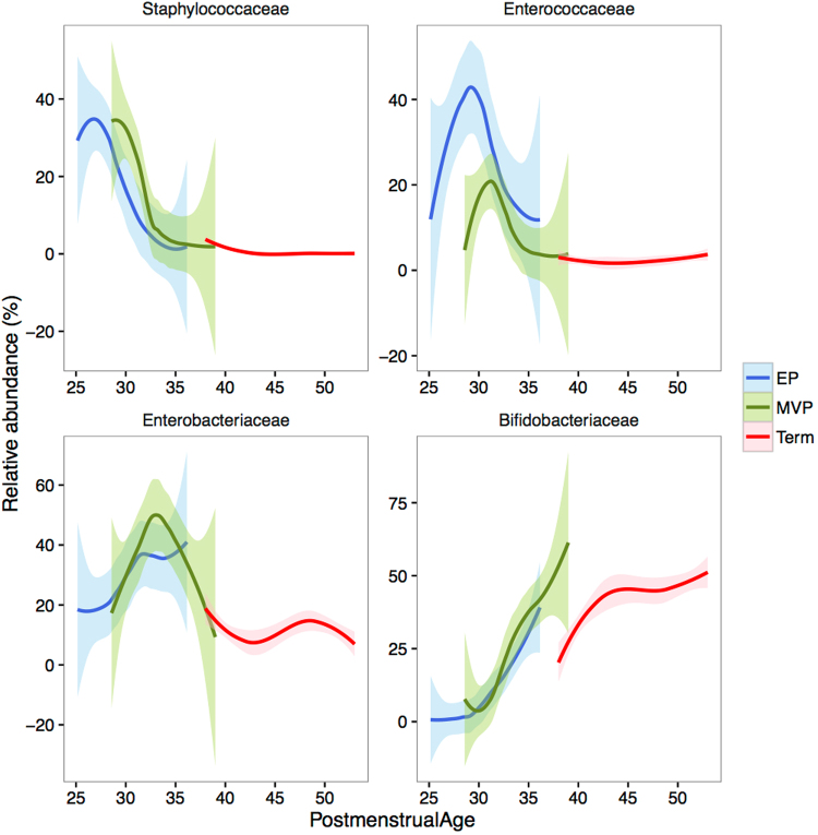 The intestinal microbiota is an important contributor to the health of preterm infants, and may be destabilized by a number of environmental factors and treatment modalities. How to promote the development of a healthy microbiota in preterm infants is largely unknown. We collected fecal samples from 45 breastfed preterm very low birth weight (birth weight < 1500 g) infants from birth until 60 days postnatal age to characterize the intestinal microbiota development during the first weeks of life in preterm infants. Fecal microbiota composition was determined by 16S rRNA amplicon sequencing. The main driver of microbiota development was gestational age; antibiotic use had strong but temporary effects and birth mode had little influence. Microbiota development proceeded in four phases indicated by the dominance of Staphylococcus, Enterococcus, Enterobacter, and finally Bifidobacterium. The Enterococcus phase was only observed among the extremely premature infants and appeared to delay the microbiota succession. The results indicate that hospitalized preterm infants receiving breast milk may develop a normal microbiota resembling that of term infants.