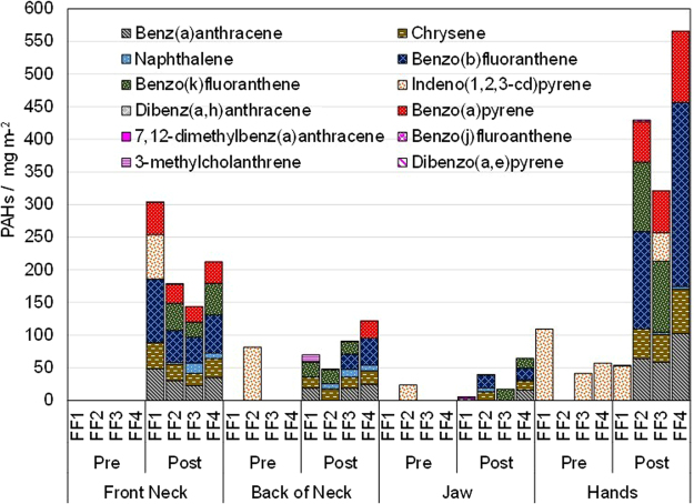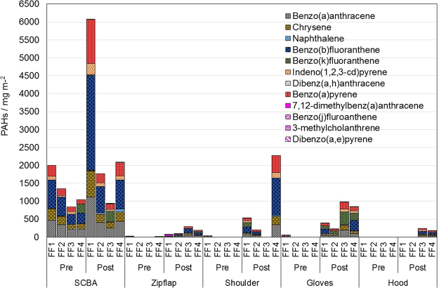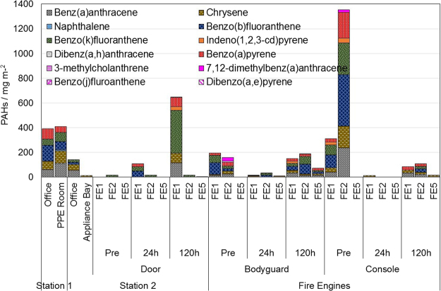 Cancer incidence appears to be higher amongst firefighters compared to the general population. Given that many cancers have an environmental component, their occupational exposure to products of carbon combustion such as polycyclic aromatic hydrocarbons (PAHs) is of concern. This is the first UK study identifying firefighters exposure to PAH carcinogens. Wipe samples were collected from skin (jaw, neck, hands), personal protective equipment of firefighters, and work environment (offices, fire stations and engines) in two UK Fire and Rescue Service Stations. Levels of 16 US Environmental Protection Agency (EPA) PAHs were quantified together with more potent carcinogens: 7,12-dimethylbenzo[a]anthracene, and 3-methylcholanthrene (3-MCA) (12 months post-initial testing). Cancer slope factors, used to estimate cancer risk, indicate a markedly elevated risk. PAH carcinogens including benzo[a]pyrene (B[a]P), 3-MCA, and 7,12-dimethylbenz[a]anthracene PAHs were determined on body surfaces (e.g., hands, throat), on PPE including helmets and clothing, and on work surfaces. The main exposure route would appear to be via skin absorption. These results suggest an urgent need to monitor exposures to firefighters in their occupational setting and conduct long-term follow-up regarding their health status.