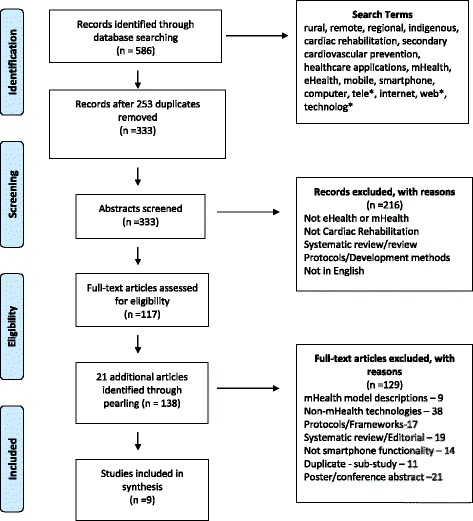 Methods: A comprehensive search of databases using key terms was conducted for the years 2000 to August 2016 to identify randomised and non-randomised trials utilizing smartphone functionality and a model of care that included CR and heart failure management. Included studies were assessed for quality and risk of bias and data extraction was undertaken by two independent reviewers.