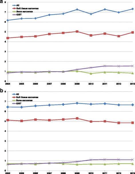 Results: The analysis included 3404 cases in men and 3442 cases in women diagnosed in 2013. The age adjusted sarcoma incidence (European standard) was 7.4 (men) and 6.6 (women) per 100,000 inhabitants. About 70% of sarcomas were soft tissue sarcomas, about 22% GIST, and about 9% bone sarcomas. The most common histological subtypes besides GIST were fibrosarcomas (14%) and liposarcomas (12%) in men and complex mixed and stromal neoplasms (22%), non-uterine leiomysarcomas (10%) and fibrosarcomas (9%) in women. Considering the trend for the years of diagnosis 2004 to 2013, there was a significant increase in incidence for GIST while the incidence of soft tissue sarcomas (only men) as well as of bone sarcoma stayed constant over time. As to soft tissue sarcoma in women, the incidence stayed constant up to the year 2009 and significantly decreased afterwards.
