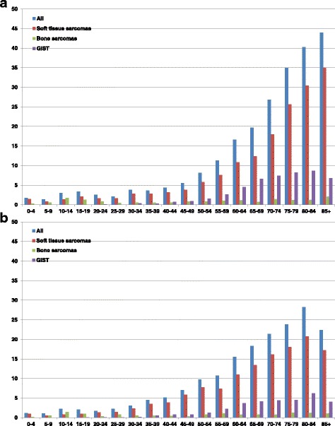Methods: Pooled data from the German Centre for Cancer Registry Data with a primary diagnosis occurring in 2013 were used. To date, this is the latest data on cancer incidence available for Germany. All German cancer registries with sufficient completeness were included (10 out of 11), covering a population of 70.0 million people, representing 87% of the German population. All malignant sarcomas according to the RARECARE Project and the WHO classification 2002 were considered for analysis and, above all, gastrointestinal stromal tumours (GIST) of uncertain behaviour. Sensitivity analysis was performed excluding certain histologies.