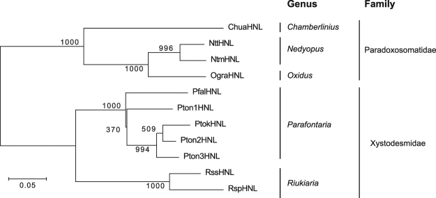 Hydroxynitrile lyases (HNLs), which are key enzymes in cyanogenesis, catalyze the cleavage of cyanohydrins into carbonyl compounds and hydrogen cyanide. Since HNLs also catalyze the reverse reaction, they are used industrially for the asymmetric synthesis of cyanohydrins, which are valuable building blocks of pharmaceuticals and fine chemicals. HNLs have been isolated from cyanogenic plants and bacteria. Recently, an HNL from the cyanogenic millipede Chamberlinius hualienensis was shown to have the highest specific activity for (R)-mandelonitrile synthesis, along with high stability and enantioselectivity. However, no HNLs have been isolated from other cyanogenic millipedes. We identified and characterized HNLs from 10 cyanogenic millipedes in the Paradoxosomatidae and Xystodesmidae. Sequence analyses showed that HNLs are conserved among cyanogenic millipedes and likely evolved from one ancestral gene. The HNL from Parafontaria tonominea was expressed in Escherichia coli SHuffle T7 and showed high specific activity for (R)-mandelonitrile synthesis and stability at a range of pHs and temperatures. The stability of millipede HNLs is likely due to disulfide bond(s). The E. coli cells expressing HNL produced (R)-mandelonitrile with 97.6% enantiomeric excess without organic solvents. These results demonstrate that cyanogenic millipedes are a valuable source of HNLs with high specific activity and stability.