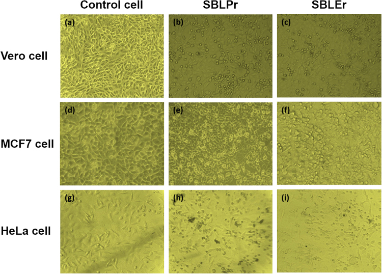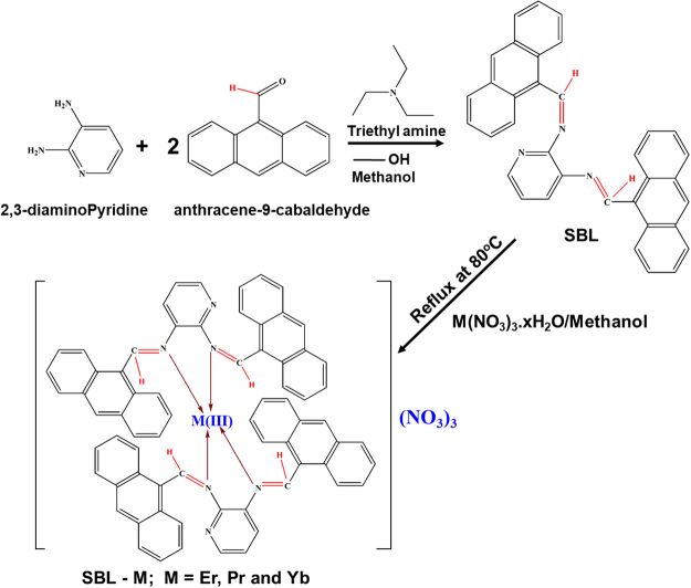 A Schiff base ligand (SBL), N2, N3-bis (anthracen-9-ylmethylene) pyridine-2, 3-diamine, was synthesized through the condensation of 2,6-diaminopyridine and anthracene-9-carbaldehyde using a 1:2 ratio. 1H NMR spectra confirmed the observation of non-involvement aromatic carboxylic proton in SBL. A novel series of lanthanide (i.e., praseodymium (Pr), erbium (Er), and ytterbium (Yb))-based SBL metal complexes was successfully synthesized, and their functional groups were elaborately demonstrated using UV-visible, Fourier transform infrared (FT-IR), and fluorescence spectroscopy analyses. FT-IR spectral studies revealed that SBL behaved as a bidentate ligand and it was structured with metal ions by the two azomethine nitrogens. The synthesized SBL-based metal complexes were elaborately performed for cytotoxicity activity versus Vero, human breast cancer (MCF7), and cervical (HeLa) anticancer cell lines.