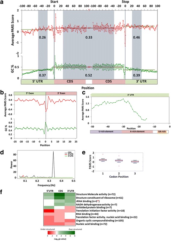 Results: We report the transcriptome-wide RNA secondary structure in zebrafish at single nucleotide resolution using Parallel Analysis of RNA Structure (PARS). This study provides the secondary structure map of zebrafish coding and non-coding RNAs. The single nucleotide pairing probabilities of 54,083 distinct transcripts in the zebrafish genome were documented. We identified RNA secondary structural features embedded in functional units of zebrafish mRNAs. Translation start and stop sites were demarcated by weak structural signals. The coding regions were characterized by the three-nucleotide periodicity of secondary structure and display a codon base specific structural constrain. The splice sites of transcripts were also delineated by distinct signature signals. Relatively higher structural signals were observed at 3' Untranslated Regions (UTRs) compared to Coding DNA Sequence (CDS) and 5' UTRs. The 3' ends of transcripts were also marked by unique structure signals. Secondary structural signals in long non-coding RNAs were also explored to better understand their molecular function.