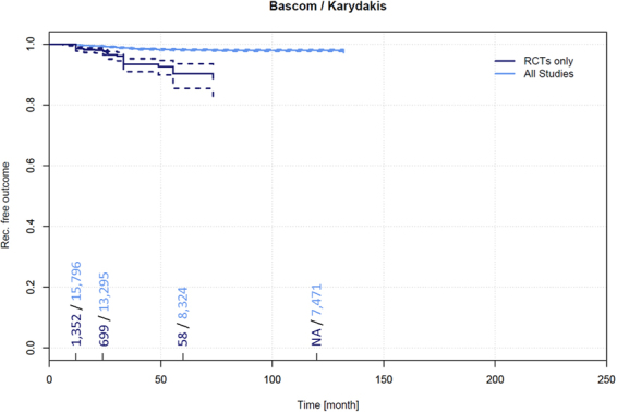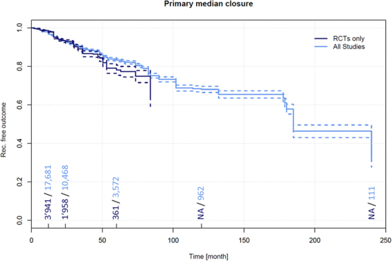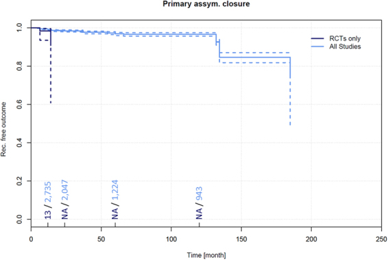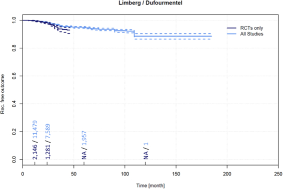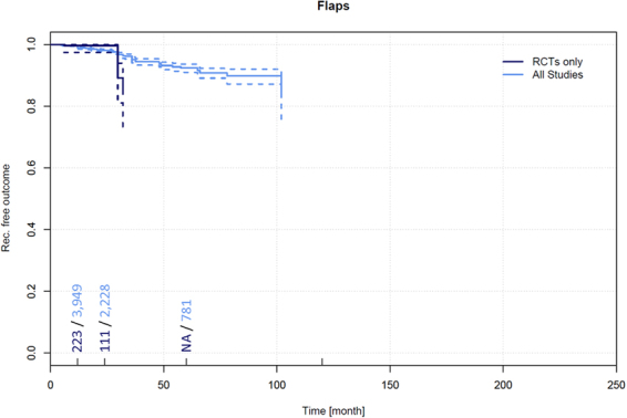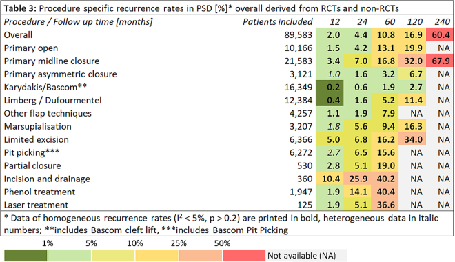 We systematically searched available databases. We reviewed 6,143 studies published from 1833 to 2017. Reports in English, French, German, Italian, and Spanish were considered, as were publications in other languages if definitive treatment and recurrence at specific follow-up times were described in an English abstract. We assessed data in the manner of a meta-analysis of RCTs; further we assessed non-RCTs in the manner of a merged data analysis. In the RCT analysis including 11,730 patients, Limberg & Dufourmentel operations were associated with low recurrence of 0.6% (95%CI 0.3-0.9%) 12 months and 1.8% (95%CI 1.1-2.4%) respectively 24 months postoperatively. Analysing 89,583 patients from RCTs and non-RCTs, the Karydakis & Bascom approaches were associated with recurrence of only 0.2% (95%CI 0.1-0.3%) 12 months and 0.6% (95%CI 0.5-0.8%) 24 months postoperatively. Primary midline closure exhibited long-term recurrence up to 67.9% (95%CI 53.3-82.4%) 240 months post-surgery. For most procedures, only a few RCTs without long term follow up data exist, but substitute data from numerous non-RCTs are available. Recurrence in PSD is highly dependent on surgical procedure and by follow-up time; both must be considered when drawing conclusions regarding the efficacy of a procedure.