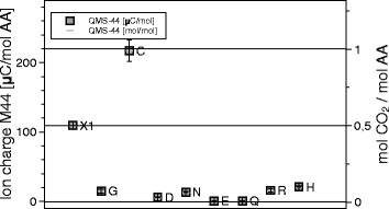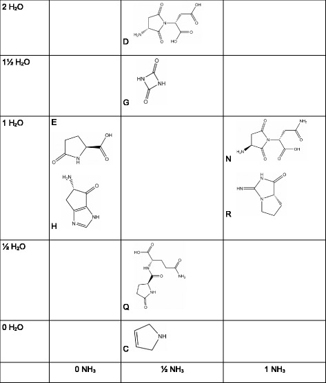 Results: Calorimetry, thermogravimetry and mass spectrometry were used to follow the thermal decomposition of the eight amino acids G, C, D, N, E, Q, R and H between 185 °C and 280 °C. Endothermic heats of decomposition between 72 and 151 kJ/mol are needed to form 12 to 70% volatile products. This process is neither melting nor sublimation. With exception of cysteine they emit mainly H2O, some NH3 and no CO2. Cysteine produces CO2 and little else. The reactions are described by polynomials, AA→a NH3+b H2O+c CO2+d H2S+e residue, with integer or half integer coefficients. The solid monomolecular residues are rich in peptide bonds.