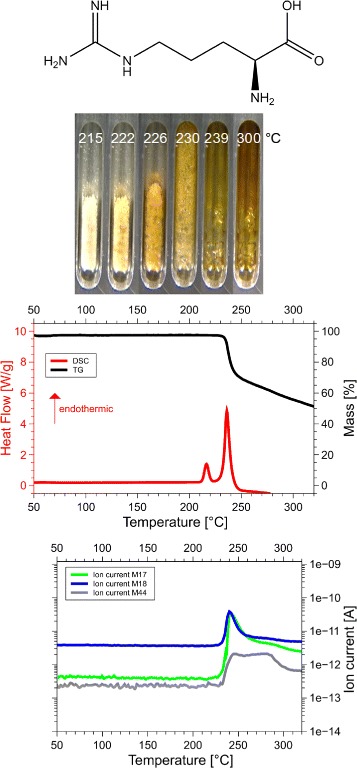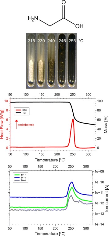 Conclusions: Eight of the 20 standard amino acids decompose at well-defined, characteristic temperatures, in contrast to commonly accepted knowledge. Products of decomposition are simple. The novel quantitative results emphasize the impact of water and cyclic condensates with peptide bonds and put constraints on hypotheses of the origin, state and stability of amino acids in the range between 200 °C and 300 °C.
