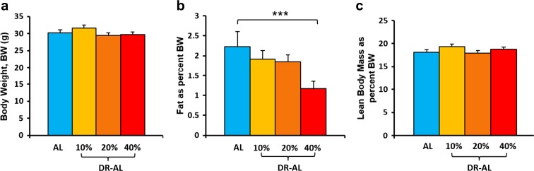 Over the past 50 years, dietary restriction (DR) has been shown to extend the life span of a wide variety of organisms. A hallmark feature of DR is improved glucose homeostasis resulting in increased glucose tolerance and insulin sensitivity of animals ranging from rodents to humans. In this study, we demonstrate the early effects of varying levels of DR on glucose tolerance. Within 10 days of 40% DR, glucose tolerance was significantly improved and by 120 days; 10 and 20% DR also showed enhanced glucose tolerance. All three levels of DR showed reduced adiposity, increased expression of genes involved in fat turnover, and a reduction in the expression for markers of inflammation. Studies have shown that mice fed a DR diet retained metabolic memory in terms of improved glucose tolerance even after DR is discontinued. We show that 40% DR not only has an early effect on glucose tolerance but also maintained it after DR was discontinued for 2 months. Therefore, improvement in glucose tolerance is brought about by all three levels of DR but the metabolic memory is not dose responsive.