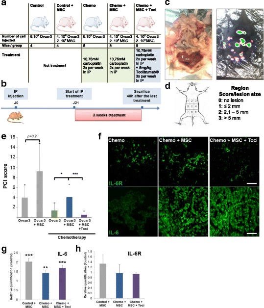 Results: We demonstrated that Tocilizumab® (anti-IL-6R therapy) in association with chemotherapy significantly reduced the peritoneal carcinosis index (PCI) than chemotherapy alone in mice xenografted with OCCs+MSCs. Further experiments showed that CCL2 and CCL5 are released by MSC in transwell co-culture and induce OCCs IL-6 secretion and chemoresistance. Finally, we found that IL-6 induced chemoresistance was dependent on PYK2 phosphorylation.