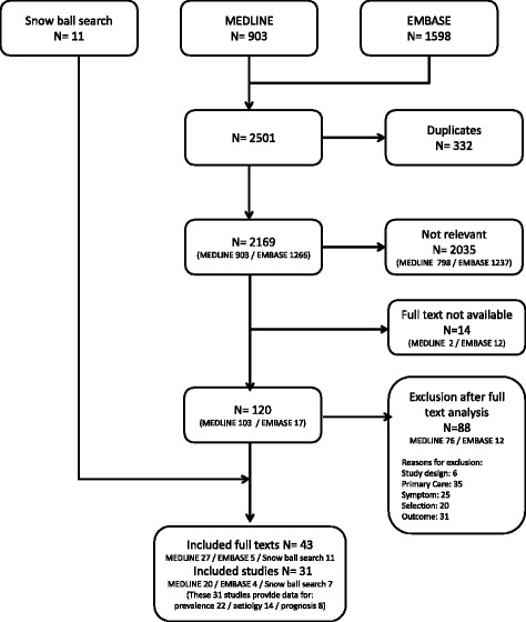 Methods: We systematically searched MEDLINE and EMBASE. Two independent researchers screened titles and abstracts according to predefined criteria. We included all studies evaluating the symptoms 'dizziness' or 'vertigo' as a reason for consultation in primary care. We extracted data about study population and methodology and prevalence, aetiology and prognosis. Two raters independently judged study quality and risk of bias. We investigated the variation across studies using forest plots, I2 and prediction intervals. Since we anticipated a great amount of clinical and unexplained statistical heterogeneity, we provided qualitative syntheses instead of pooled estimates.