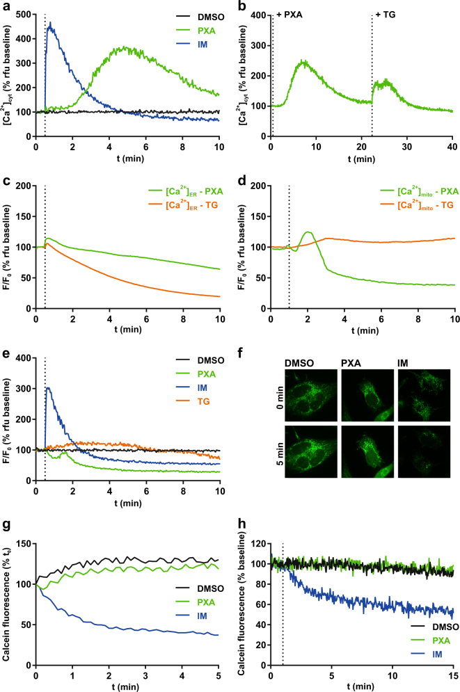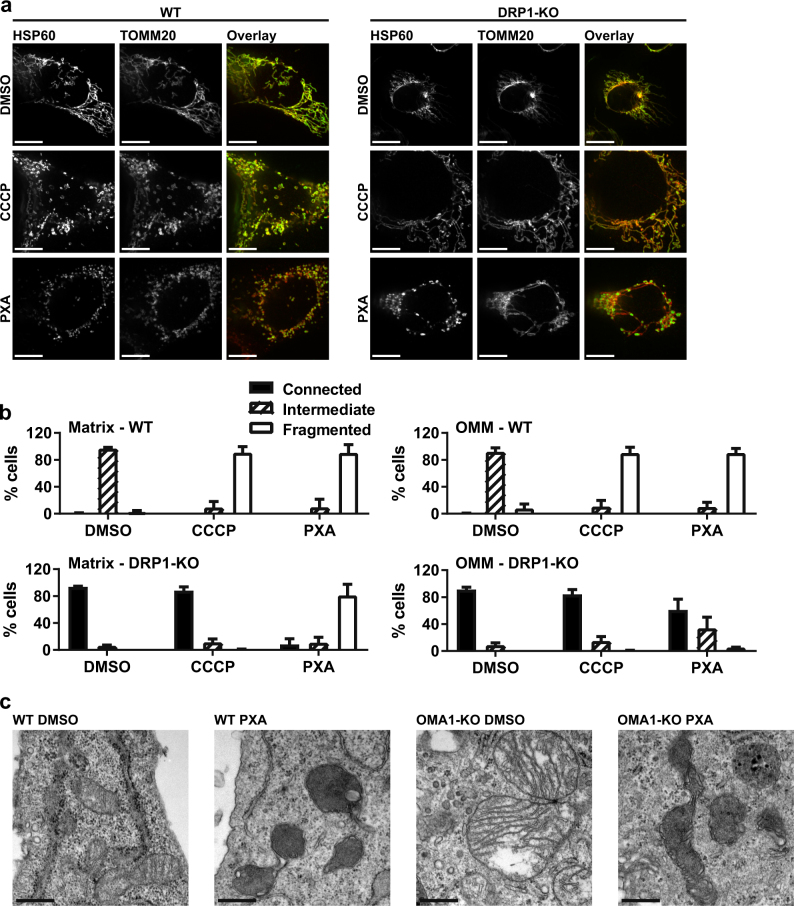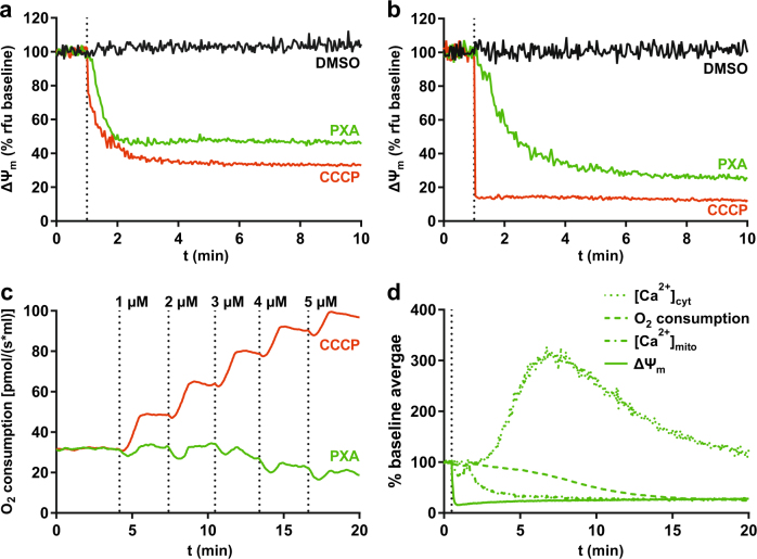 Mitochondria are cellular organelles with crucial functions in the generation and distribution of ATP, the buffering of cytosolic Ca2+ and the initiation of apoptosis. Compounds that interfere with these functions are termed mitochondrial toxins, many of which are derived from microbes, such as antimycin A, oligomycin A, and ionomycin. Here, we identify the mycotoxin phomoxanthone A (PXA), derived from the endophytic fungus Phomopsis longicolla, as a mitochondrial toxin. We show that PXA elicits a strong release of Ca2+ from the mitochondria but not from the ER. In addition, PXA depolarises the mitochondria similarly to protonophoric uncouplers such as CCCP, yet unlike these, it does not increase but rather inhibits cellular respiration and electron transport chain activity. The respiration-dependent mitochondrial network structure rapidly collapses into fragments upon PXA treatment. Surprisingly, this fragmentation is independent from the canonical mitochondrial fission and fusion mediators DRP1 and OPA1, and exclusively affects the inner mitochondrial membrane, leading to cristae disruption, release of pro-apoptotic proteins, and apoptosis. Taken together, our results suggest that PXA is a mitochondrial toxin with a novel mode of action that might prove a useful tool for the study of mitochondrial ion homoeostasis and membrane dynamics.