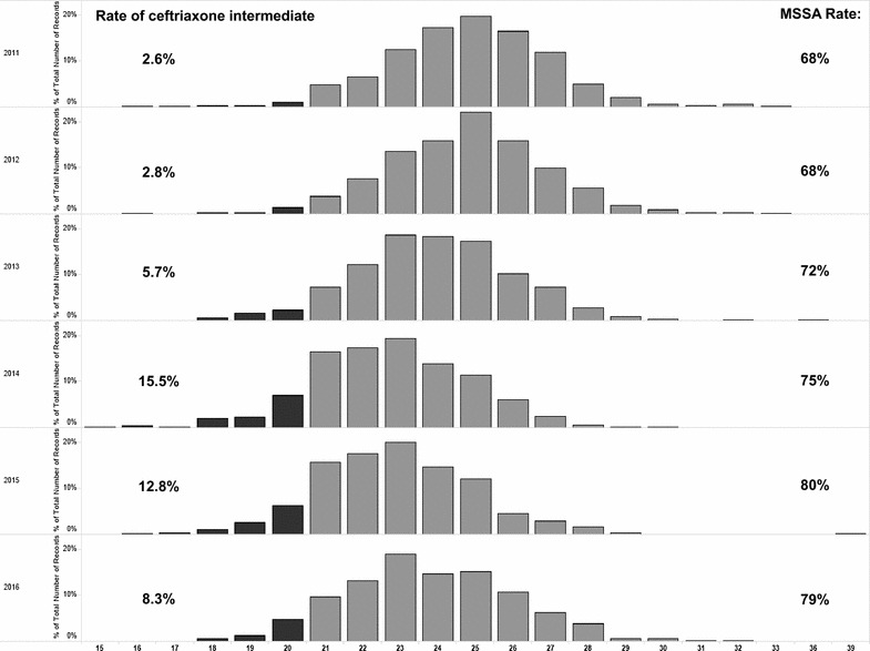 Results: A total of 3992 MSSA clinical isolates in the last 6 years were analyzed for their in vitro cefazolin and ceftriaxone susceptibilities. While all MSSA isolates exhibited cefazolin susceptibilities within the "susceptible" zone range, there have been a proportion of isolates with ceftriaxone susceptibilities falling in "intermediate" zones, ranging from 2.6% in 2011 to 8.3% in 2016.