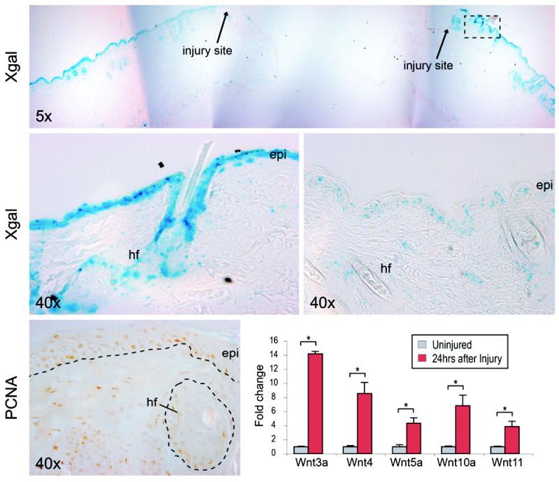 Results: Numerous individual Wnt ligands increased in expression after wounding, including Wnt3a, Wnt4, Wnt10a, and Wnt11. A specific pattern of Wnt activity was observed, localized to the hair follicle and epidermis. Mice injected with rmWnt3a exhibited faster wound closure, increased scar size, and greater expression of fibroblast growth factor receptor-2 and type I collagen.