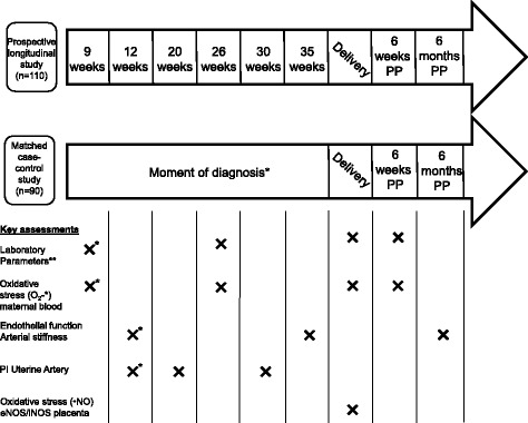Methods/design: The study is divided into two arms, a prospective longitudinal study and a matched case control study. In the longitudinal study, pregnant patients ≥18 years old with a singleton pregnancy will be followed throughout pregnancy and until 6 months post-partum. In the case control study, cases with PE will be compared to matched normotensive pregnant women. Maternal blood concentration of superoxide (O2•) and placental concentration of •NO will be determined using EPR (electron paramagnetic resonance). Endothelial function and arterial stiffness will be evaluated using respectively Peripheral Arterial Tonometry (PAT), Flow-Mediated Dilatation (FMD) and applanation tonometry. Placental expression of eNOS (endothelial NOS) will be determined using immune-histochemical staining. Target recruitment will be 110 patients for the longitudinal study and 90 patients in the case-control study.