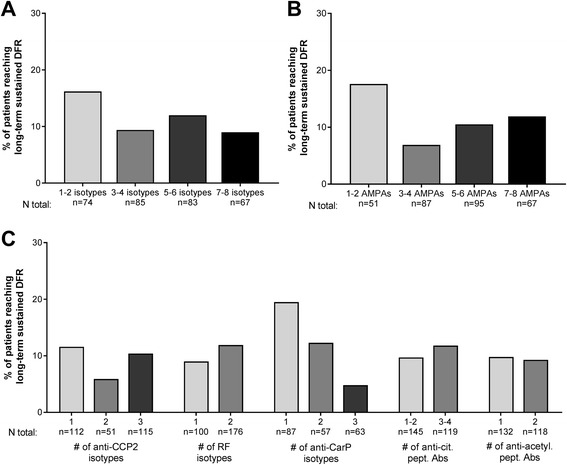 Results: Patients with a broad autoantibody profile at baseline had a significantly better early treatment response: ΔDAS 0-4 months of 1-2, 3-4, and 5-6 vs 7-8 isotypes, -1.5 (p < 0.001), -1.7 (p = 0.03), and -1.8 (p = 0.04) vs -2.2. Similar results were observed for AMPA number. However, patients with a broad baseline autoantibody profile achieved less initial DFR. For long-term sustained DFR there was no longer an association with the breadth of the autoantibody response. When assessing autoantibodies at the moment of tapering, similar trends were observed.