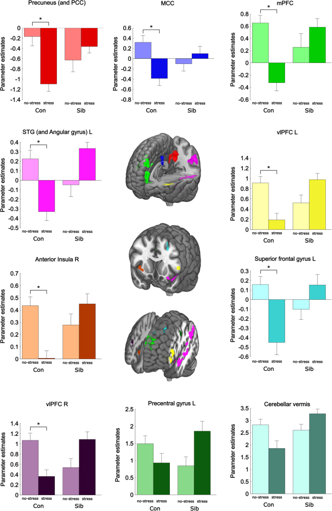 Stress is a major risk factor for almost all psychiatric disorders, however, the underlying neurobiological mechanisms remain largely elusive. In healthy individuals, a successful stress response involves an adequate neuronal adaptation to a changing environment. This adaptive response may be dysfunctional in vulnerable individuals, potentially contributing to the development of psychopathology. In the current study, we investigated brain responses to emotional stimuli following stress in healthy controls and at-risk individuals. An fMRI study was conducted in healthy male controls (N = 39) and unaffected healthy male siblings of schizophrenia patients (N = 39) who are at increased risk for the development of a broad range of psychiatric disorders. Brain responses to pictures from the International Affective Picture System (IAPS) were measured 33 min after exposure to stress induced by the validated trier social stress test (TSST) or a control condition. Stress-induced levels of cortisol, alpha-amylase, and subjective stress were comparable in both groups. Yet, stress differentially affected brain responses of schizophrenia siblings versus controls. Specifically, control subjects, but not schizophrenia siblings, showed reduced brain activity in key nodes of the default mode network (PCC/precuneus and mPFC) and salience network (anterior insula) as well as the STG, MTG, MCC, vlPFC, precentral gyrus, and cerebellar vermis in response to all pictures following stress. These results indicate that even in the absence of a psychiatric disorder, at-risk individuals display abnormal functional activation following stress, which in turn may increase their vulnerability and risk for adverse outcomes.