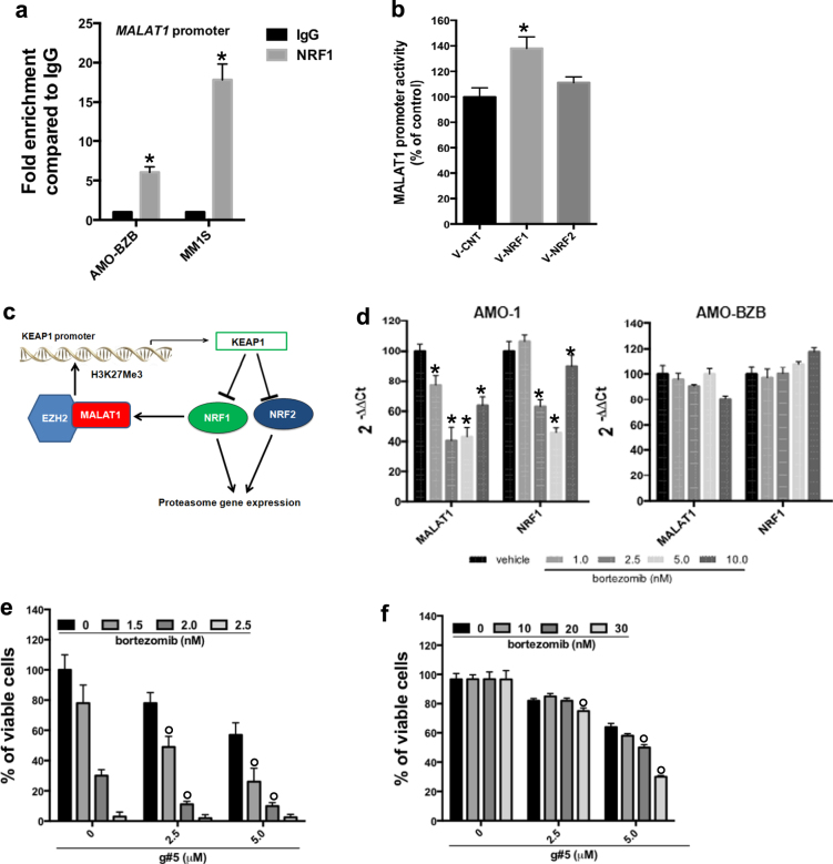 The biological role and therapeutic potential of long non-coding RNAs (lncRNAs) in multiple myeloma (MM) are still to be investigated. Here, we studied the functional significance and the druggability of the oncogenic lncRNA MALAT1 in MM. Targeting MALAT1 by novel LNA-gapmeR antisense oligonucleotide antagonized MM cell proliferation and triggered apoptosis both in vitro and in vivo in a murine xenograft model of human MM. Of note, antagonism of MALAT1 downmodulated the two major transcriptional activators of proteasome subunit genes, namely NRF1 and NRF2, and resulted in reduced trypsin, chymotrypsin and caspase-like proteasome activities and in accumulation of polyubiquitinated proteins. NRF1 and NRF2 decrease upon MALAT1 targeting was due to transcriptional activation of their negative regulator KEAP1, and resulted in reduced expression of anti-oxidant genes and increased ROS levels. In turn, NRF1 promoted MALAT1 expression thus establishing a positive feedback loop. Our findings demonstrate a crucial role of MALAT1 in the regulation of the proteasome machinery, and provide proof-of-concept that its targeting is a novel powerful option for the treatment of MM.