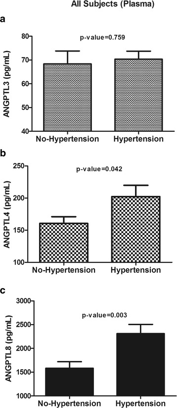 Conclusions: In conclusion, our data illustrate that ANGPTL4 and ANGPTL8 levels in both plasma and adipose tissues are increased in subjects with hypertension. The elevated levels of ANGPTL4 and ANGPTL8 in hypertensive subjects highlight their potential involvement, their potential role as biomarkers for hypertension and their therapeutic value in hypertension given their roles in regulating lipid metabolism.