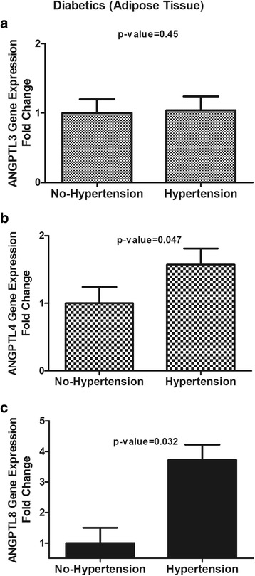 Results: We found that ANGPTL4 (202.49 ± 17.44 ng/mL vs. 160.64 ± 10.36 ng/mL, p = 0.04) and ANGPTL8 levels (2310.96 ± 194.88 pg/mL vs. 1583.35 ± 138.27 pg/mL, p = 0.001) were higher in hypertensive subjects than non-hypertensive subjects. However, ANGPTL3 levels were not significantly different between the two populations. Similarly, ANGPTL4 and ANGPTL8 levels were also elevated in subjects with T2D and hypertension than in those with T2D but not hypertension. Additionally, people with highest tertiles of ANGPTL8 had higher odds of having hypertension (odd ratio [OR] = 3.8, 95% confidence interval [CI] = (1.5-9.8), p-Value = 0.005. Similar to its plasma levels, ANGPTL4 and ANGPTL8 were higher in adipose tissue.