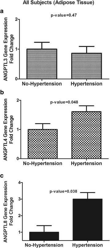 Methods: A total of 119 subjects, including 69 hypertensive and 50 non-hypertensive subjects, were enrolled. ANGPTL3, ANGPTL4 and ANGPTL8 plasma levels were measured by ELISA, whereas their levels in adipose tissue were assessed via real-time PCR.