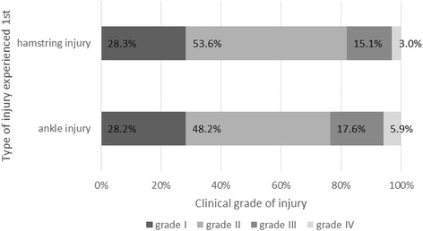 Results: Athletes with a preceding ankle injury had a statistically significantly higher chance of experiencing a subsequent hamstring injury compared with athletes who had experienced a hamstring injury as their first traumatic event (x2 = 4.245, p = 0.039). The proportion of both ankle and hamstring injury events was not statistically different between female (18%) and male (11%) athletes. Age and grade of injury did not influence the proportion of ankle and/or hamstring injury events.